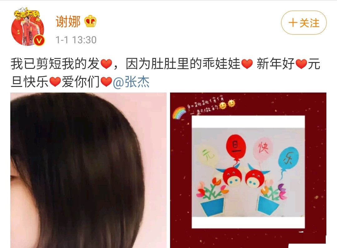 新年的第一天,谢娜在社交平台官宣怀二胎。她称自己已剪短了头发,是为了肚肚里的乖娃娃,在那之后谢娜明显减少工作量。