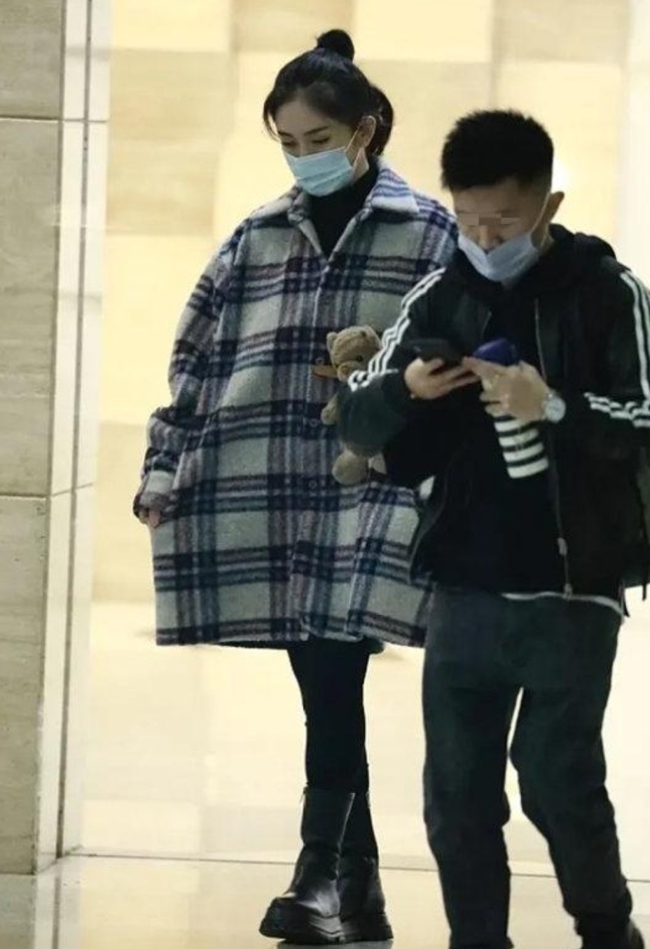 谢娜在官宣怀孕后曾被拍到现身机场,当时的她虽然也穿了一件宽松的长款大衣,但双腿笔直,身材还比较纤细。