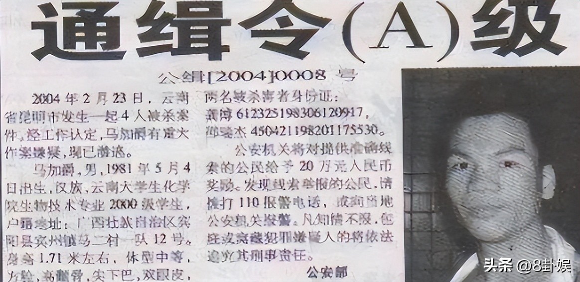 警告警方调查,种种证据都指向“消失的第五人”马加爵,迅速发布通缉令开始全国对马加爵的抓捕,直至马加爵落网。