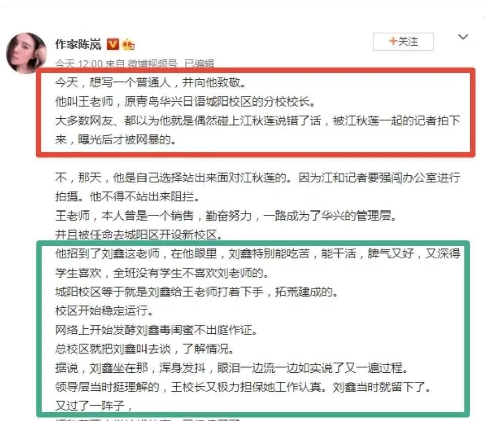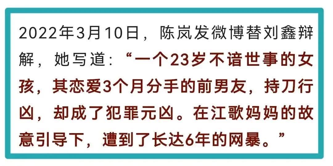 作家陈岚一直都力撑刘鑫,她多次发文质疑江歌的母亲江秋莲。