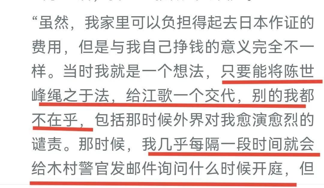 刘鑫称她一直想把陈世锋绳之以法,然后给江歌一个交待。即使自己还会遭遇网爆,还会被人谴责,也不会在乎。