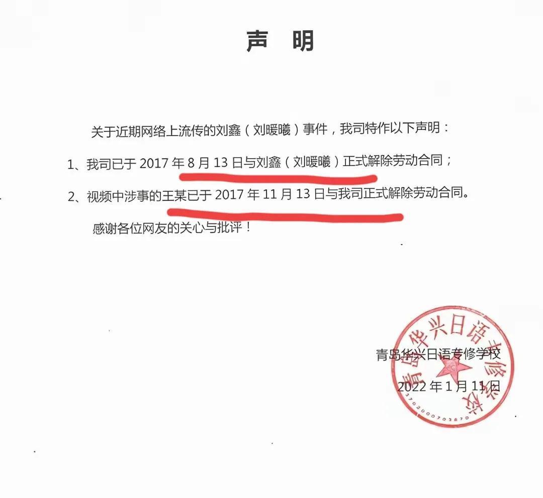 2022年1月份,公司还发了一份声明,刘鑫在2017年8月已经解除劳动合同,而王老师也在2017年11月离开了学校。