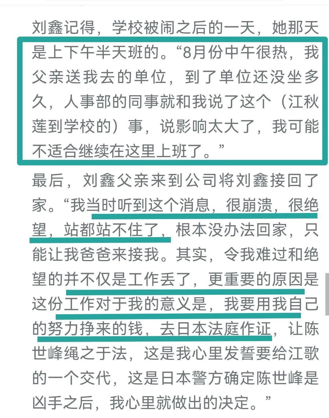 刘鑫这份日语老师的工作做了5个月,到8月份被人发现。她称江歌母亲还有记者来学校,要人事提供她的联系方式。