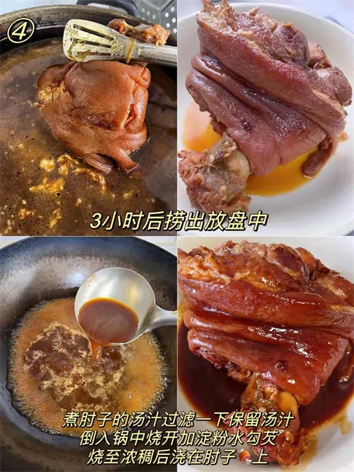 这3小时里,家中的每一个角落都会弥漫着肘子的香气。你可以时不时地去看看锅中的情况,翻动一下肘子,让它受热更加均匀。随着时间的推移,肘子的颜色会变得越来越深邃诱人,肉质也会变得更加软烂。