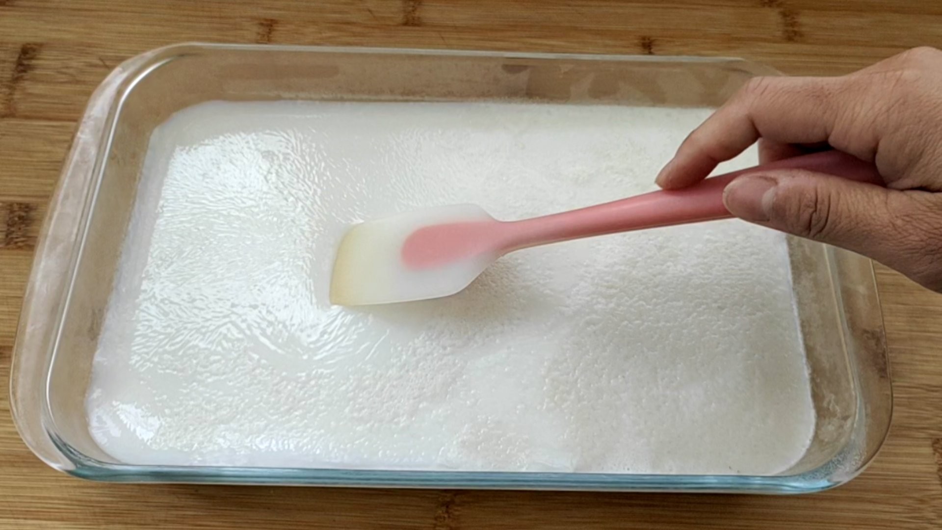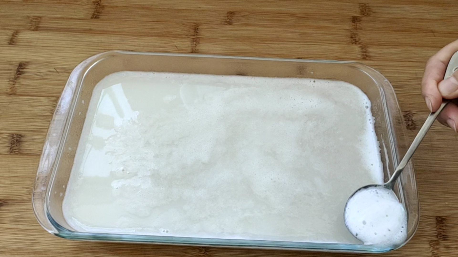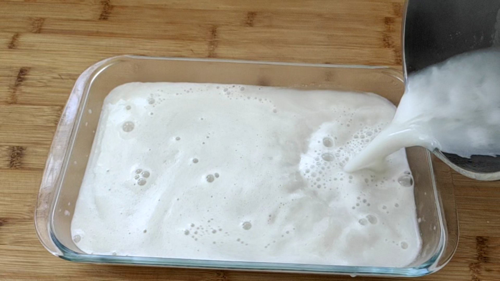 ④ 打好以后,倒容器里,撇掉表面的浮沫,然后晾冷。冷透以后转到冰箱冷藏室,冷藏至凝固。