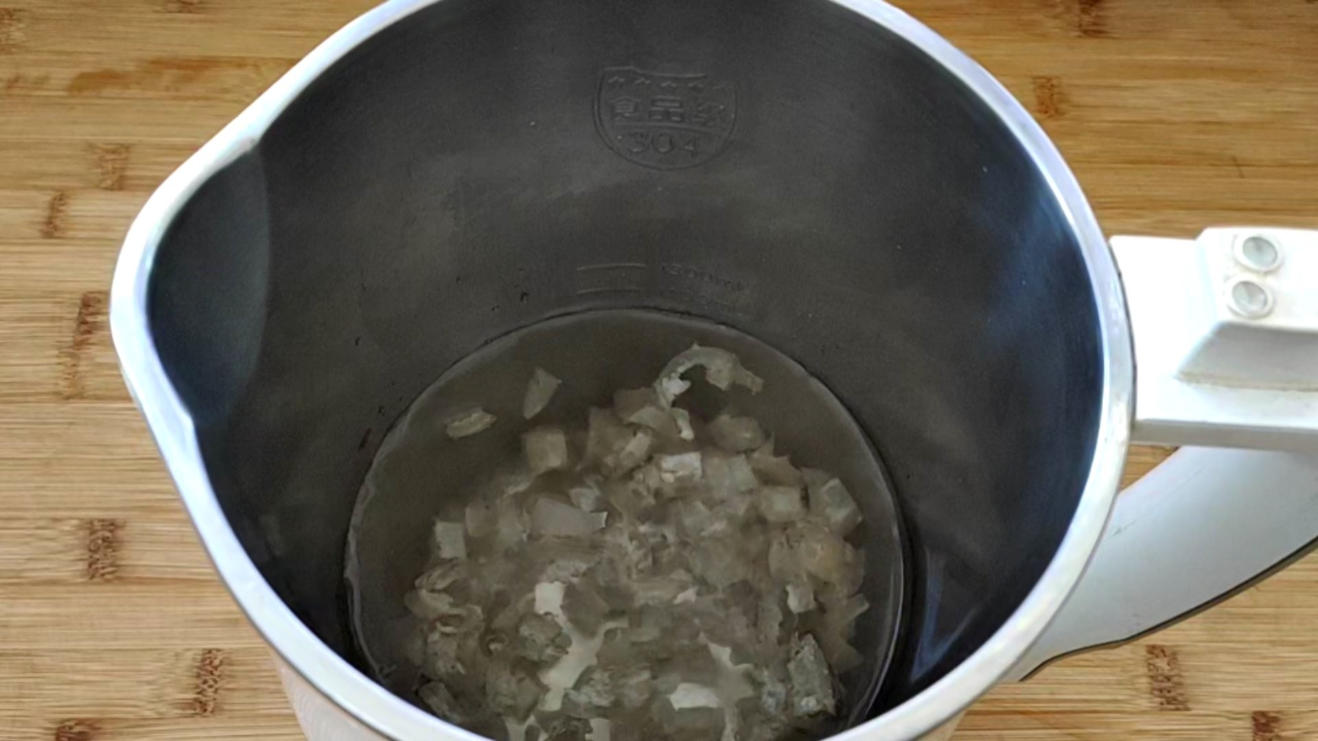 ③ 皮冻放豆浆机,加900毫升清水,到豆浆机的最低水位线那里。这个水量做出来的口感非常Q, 如果喜欢口感嫩一点的话,可以把水加到1100毫升。然后启动豆浆键或者米糊功能都可以。