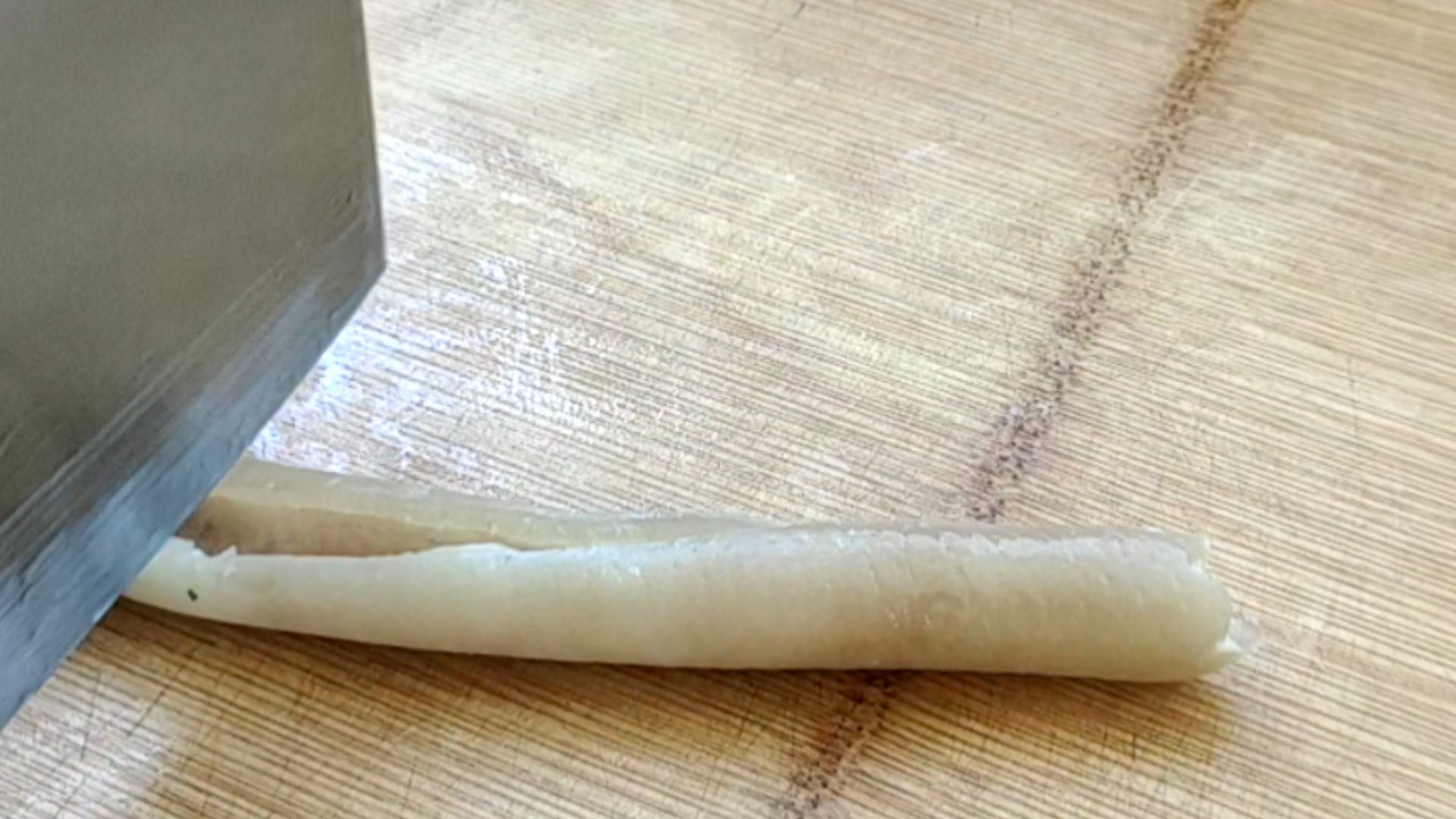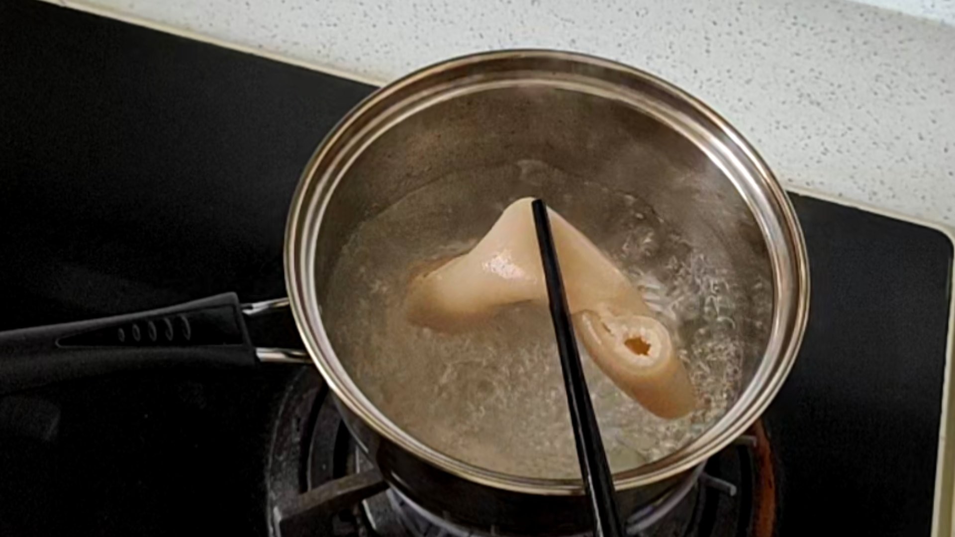 ① 准备一大块新鲜猪皮,把上面的肥肉和油脂都切掉。锅里水烧开以后,把猪皮焯水一分钟。煮到猪皮透亮以后捞出,然后再刮一遍油脂,刮干净点吃起来没那么腻。