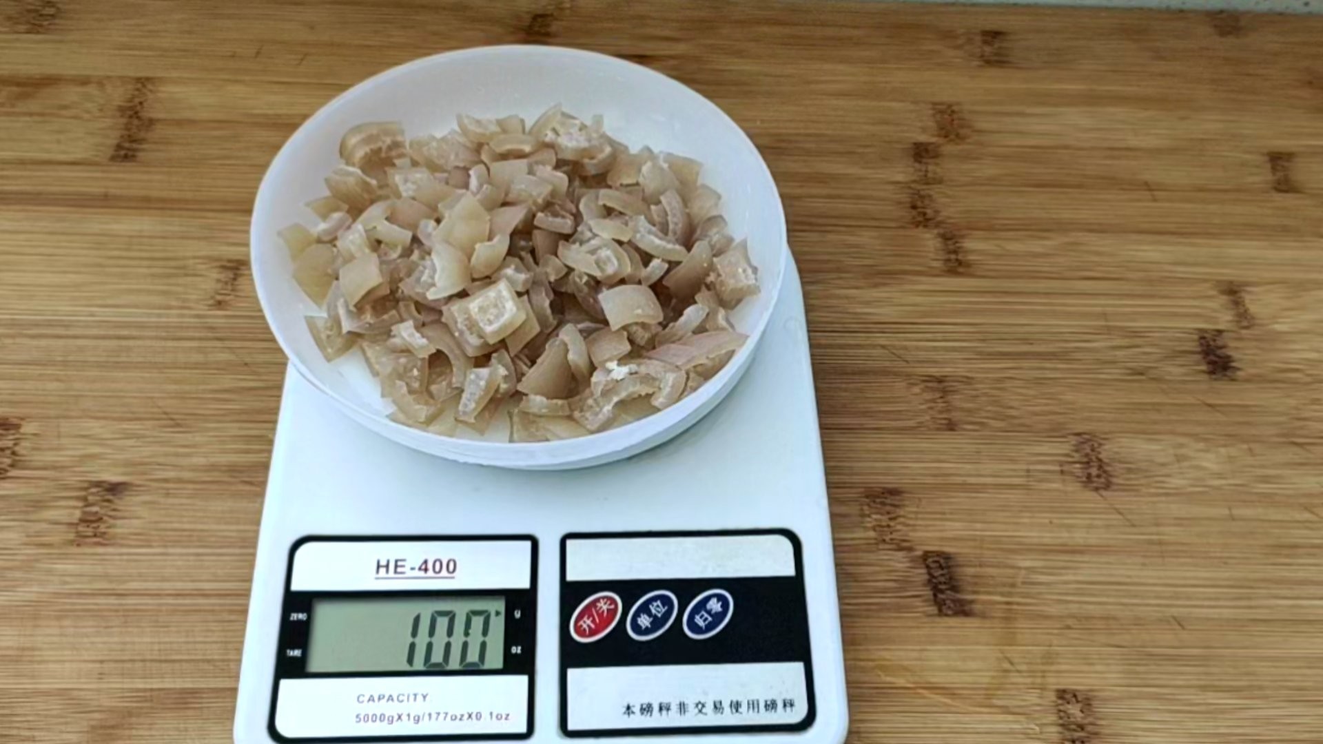 ② 把猪皮切成小碎丁,然后称出来100克,一次有这么多就够了。可以一次多做一点,然后分成100克每份,放冰冻室冻起来,想做皮冻了拿出来二十几分钟就做好了,非常方便。