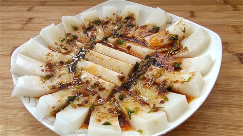 ⑤ 凝固好以后,脱模切片,浇上你喜欢的凉拌酱汁就可以了。