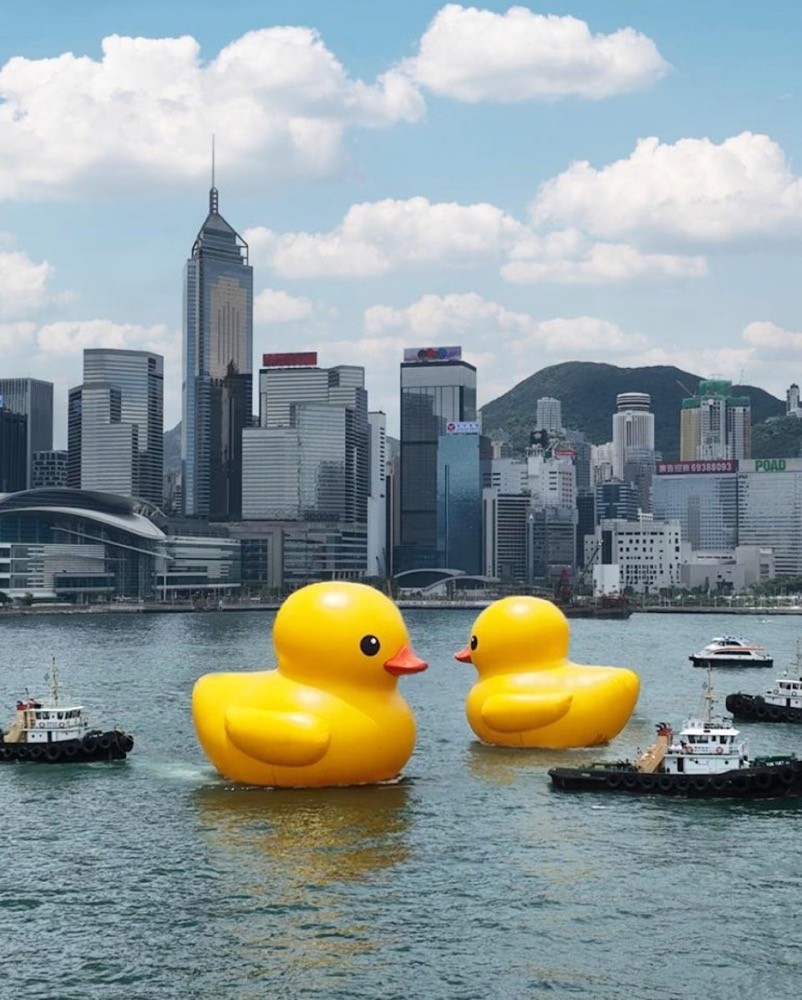 荷兰概念艺术师弗洛伦泰因·霍夫曼(Florentijn Hofman)创作的巨型《橡皮鸭二重畅(DOUBLE DUCKS with Hong Kong Signature Icons)》在6月10日正式于香港维港中环海面开放予公众,当时李嘉欣率先晒出合照,即刻吸引大批网友围观。
