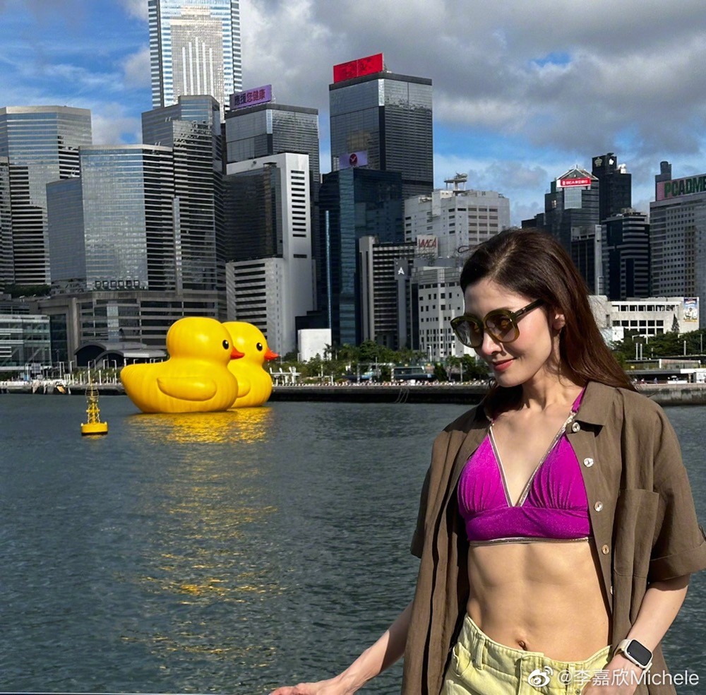李嘉欣站在围栏旁,与身后远处的橡皮鸭合照,她身穿紫色Bra top搭配淡黄色短裤,外披一套短袖恤衫,随性自然,大骚结实腹肌同马甲线,身材非常吸睛。不得不说,时光对这位大美人真是特别眷顾。