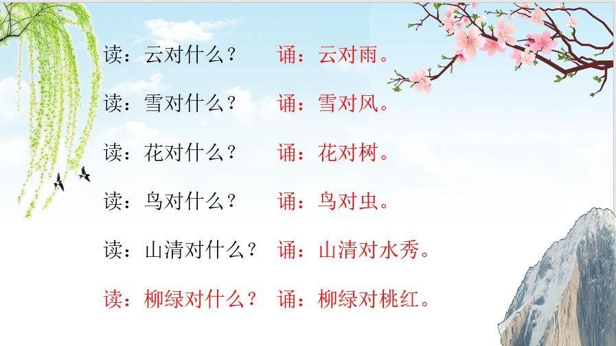 “云对雨,雪对风,花对树,鸟对虫。山清对水秀,柳绿对花红”。《对韵歌》也叫《笠翁对韵》,因为其作者李渔号笠翁,故有此名。其内容为三字对,五字对和七字对,以天文、地理、花木鸟兽等两两相对,所写丰富有趣、简单易懂,读起来亦是朗朗上口、便于记忆,同时也为孩子日后的写作提供了很好的素材。