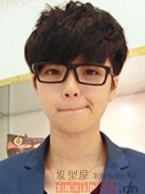 圆脸男生适合什么发型呢?这款深咖色系的齐刘海短发,搭配一副黑色的眼镜,迷人的表情,真是萌帅萌帅的。