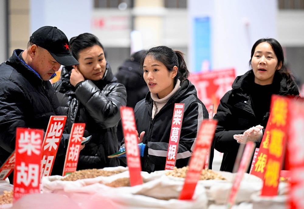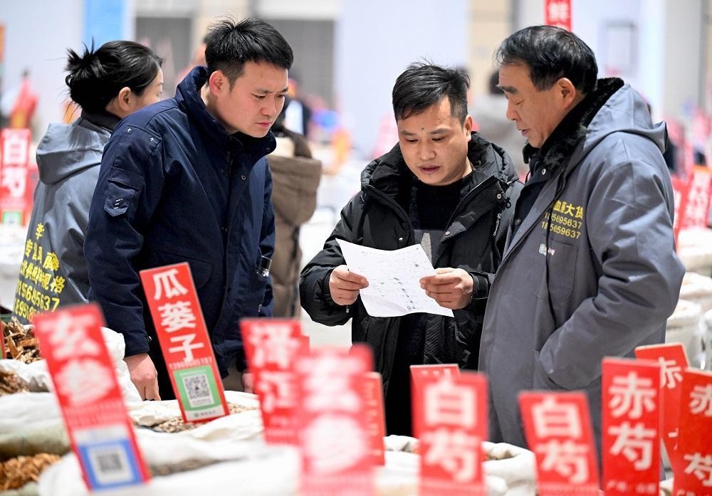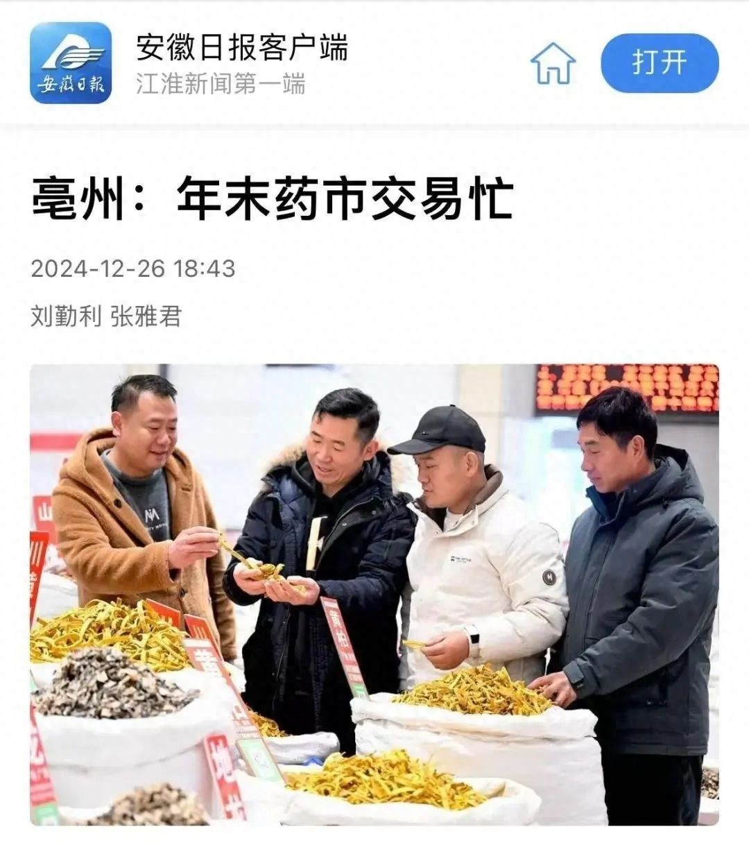 12月26日,《安徽日报》客户端发布了《亳州:年末药市交易忙》的新闻报道,报道描述了中药材客商在中国亳州中药材国际商品交易中心内选购中药材的场景。