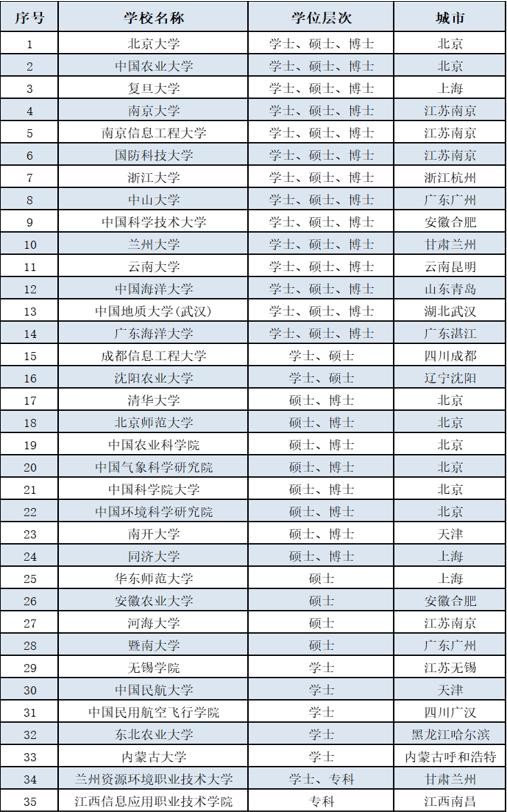 目前我国开设大气科学类相关专业的高校共有35所,其中进行高考招生的高校有23所,有21所本科院校,2所职业院校。其余12所招收大气科学类及相关专业的硕士生和博士生。