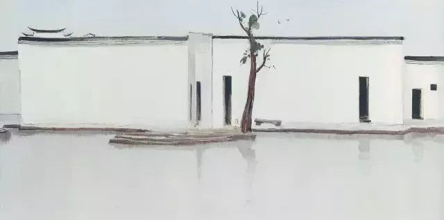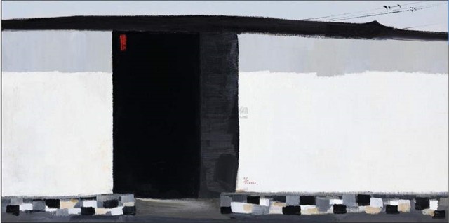 过了将近20年,当吴冠中再次看到这幅画时,有一种别样的沉思,于是在2002年吴冠中对这幅画进行了再创作,又完成了一幅油画版的《秋瑾故居》,在这幅作品上那扇门更黑了,黑白灰三色对比更加明显,画面空间更开阔。