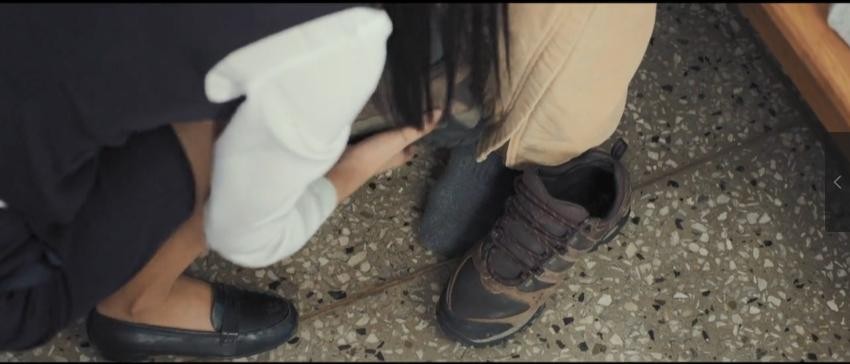 他的女儿来警察局接他,女儿帮他把穿反的鞋摆正,但是这双鞋不是开头的白鞋。
