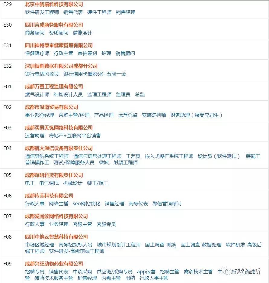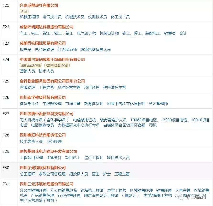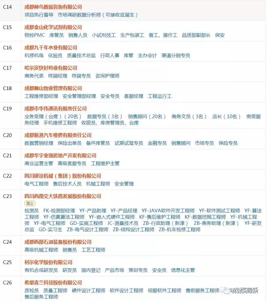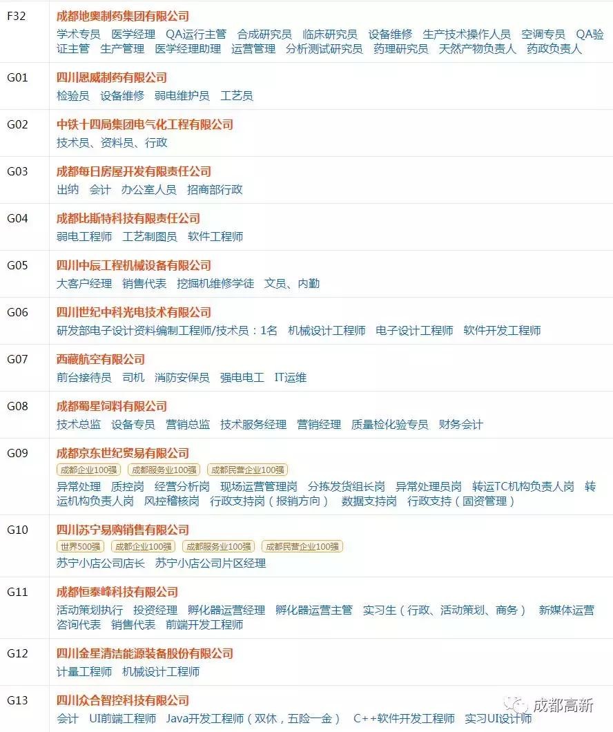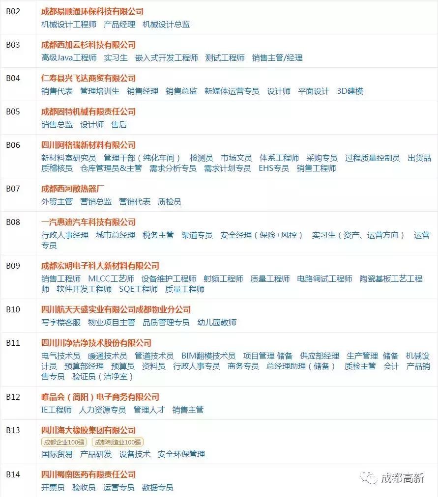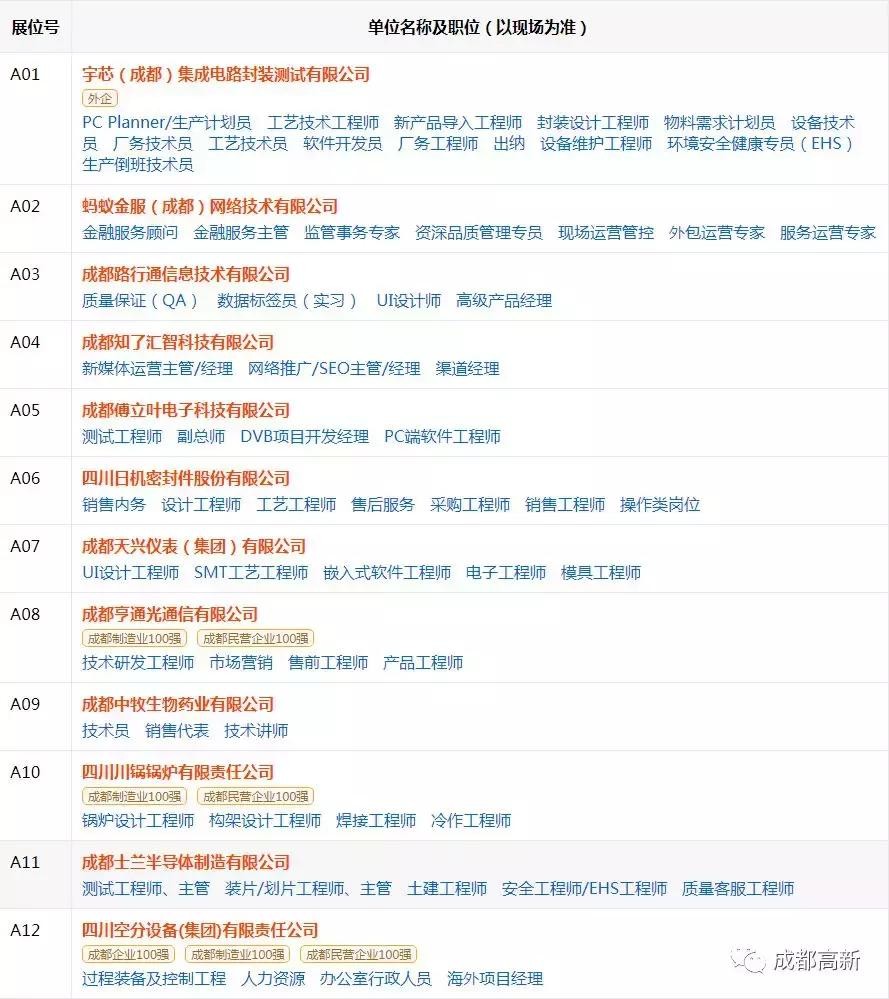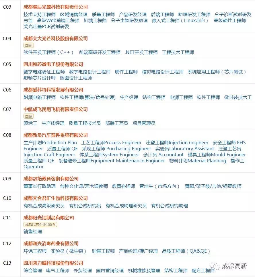 招聘会现场将有来自全市的300家企业参会,其中不乏代表成都市产业发展方向的支柱产业和高新技术企业。中航成飞、联想电子、士兰半导体、十九冶等大型集团及其旗下企业,也有利尔化学、苏宁易购、京东、云图控股等优质上市股份公司,还有成都交大光芒、交大铁路发展股份有限公司等国有企业。据统计,参会单位已发布各类中高级岗位和基础岗位8000余个。