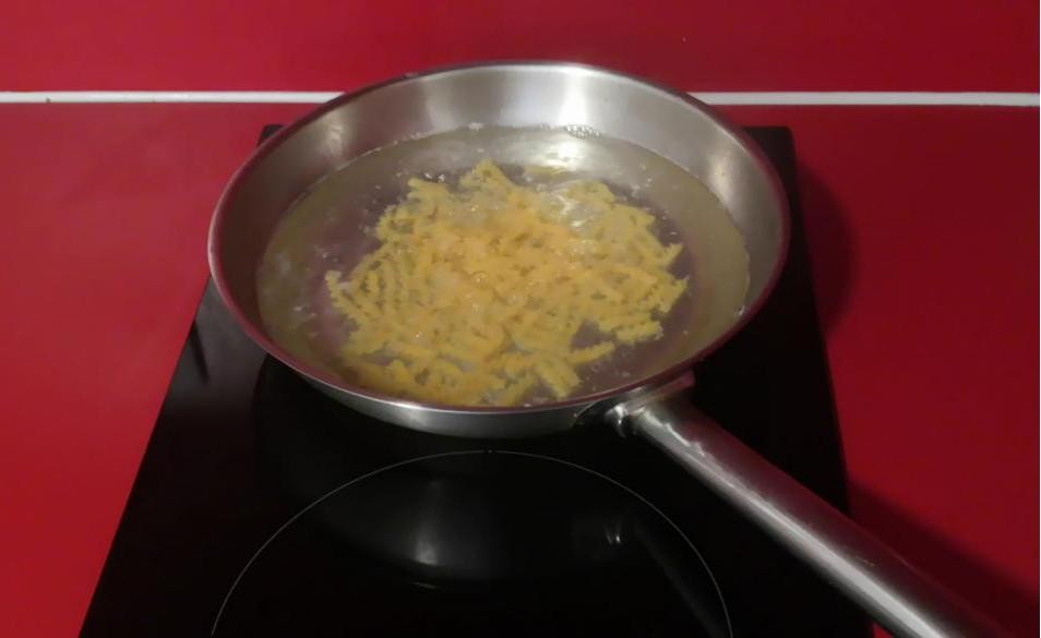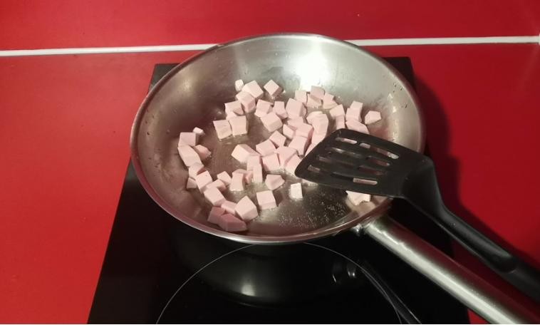 5. 油温达到5-6层时,放入火腿丁,翻炒。