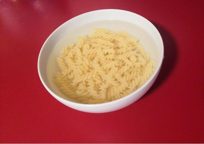 3.将煮熟的意面捞起,沥干,放入凉水中备用。