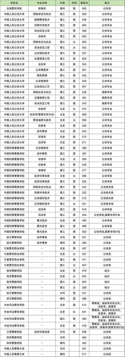 云南警官学院:文科男生506分、女生526分,理科男生474分、女生518分