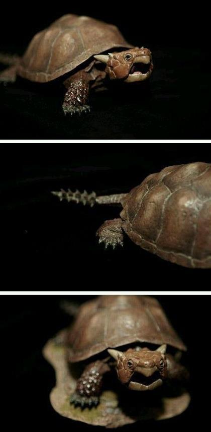 卷角龟尾巴有凸出的骨刺,并且尾巴长度占身体总长的三分之一,这意味着尾巴是它最厉害的武器,如果被这个尾巴扫中,人的腿骨可能会断掉。
