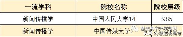 中国人民大学和中国传媒大学是“新闻传播学”一流学科建设高校。院校名称后面带的数字,是该校“一流学科”的总数,如中国人民大学有14个“一流学科”。中国传媒大学有2个“一流学科”,除“新闻传播学”之外,“戏剧与影视学”(艺术学)也是“一流学科”。