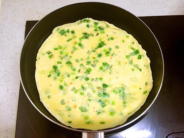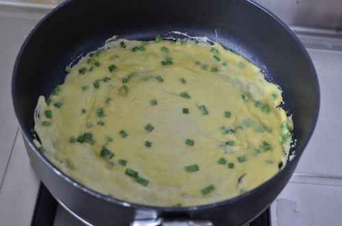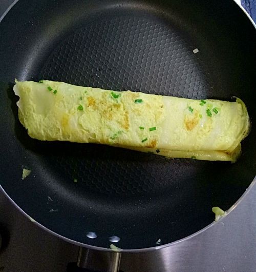 4,撒葱花、芝麻和肉松,待蛋液即将凝固的时候将饼卷起,卷起后小火再煎一下,待蛋卷上色成金黄即可切块装盘。