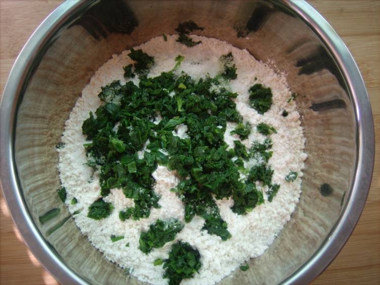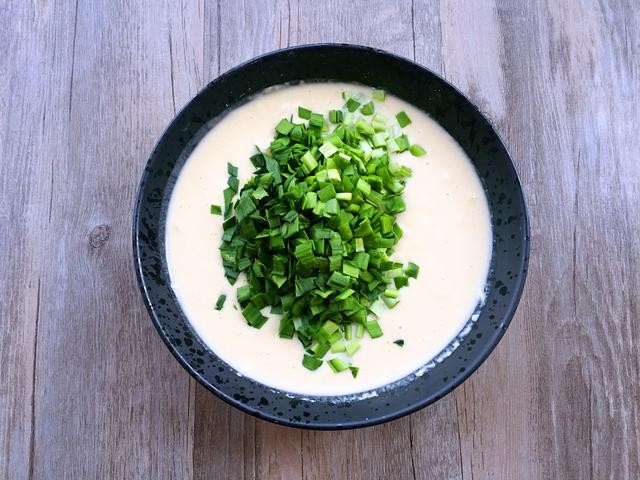 2,芹菜叶浸泡洗净,切成碎末放到小盆里,打进两个鸡蛋,加盐、胡椒粉、一袋牛奶、适量面粉搅拌成稀面糊;