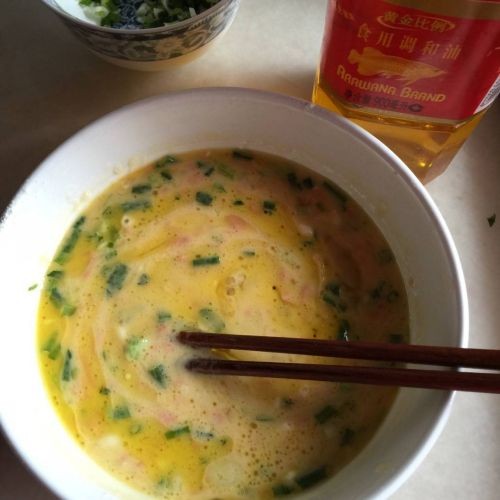 3,鸡蛋打散,切点韭菜末放进蛋液,再加点盐,拌匀备用