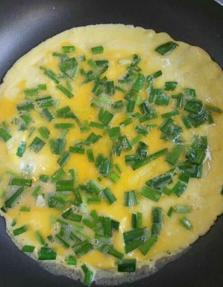材料:韭菜一把,土鸡蛋三个,盐适量;