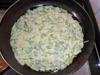 6、平底锅上火,锅热后加薄薄一层油,油温7成热倒入韭菜鸡蛋糊,中火,将平底锅抬高一点,慢慢煎;