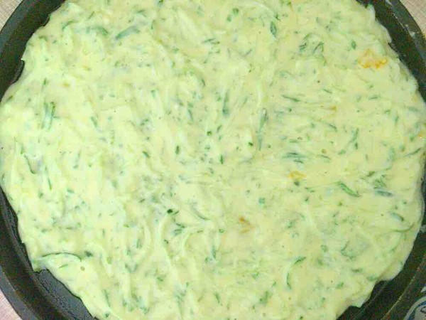 3,平底锅烧热后刷少许食油,取适量黄瓜鸡蛋面糊糊倒入锅内,两面都煎至黄金后出锅即可;