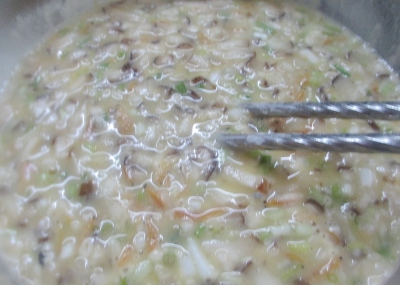 3,把切好的香菇碎,小葱和虾皮一起放入碗中加少许盐,搅拌均匀;