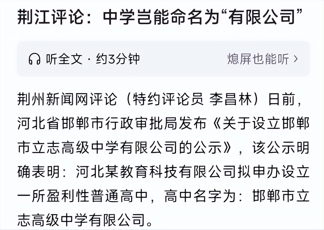 河北拟新建一所“营利性”高中,校名是“某某市立志高级中学有限公司”。没错,连名字都懒得掩盖,学校直接挂上了“有限公司”的招牌。