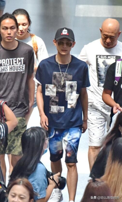 走在人群中也要霸气十足,他的这身搭配算是混搭的风格。藏蓝色的短t上映有许多规则图案,这些几何型的点缀,让简单的短袖看起来不那么平凡,而袖口以白色为翻边在这个深色的衣服上比较显眼,这件衣服的设计者想必比较细心。最引人注目的还是他的短裤,及膝的短裤上印着星空的图案,这样的衣服并不常见,浩瀚的星空,给人无限的想象,也让他的这身搭配有了神秘的色彩。