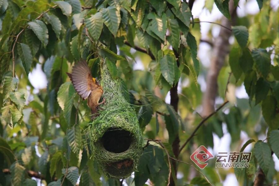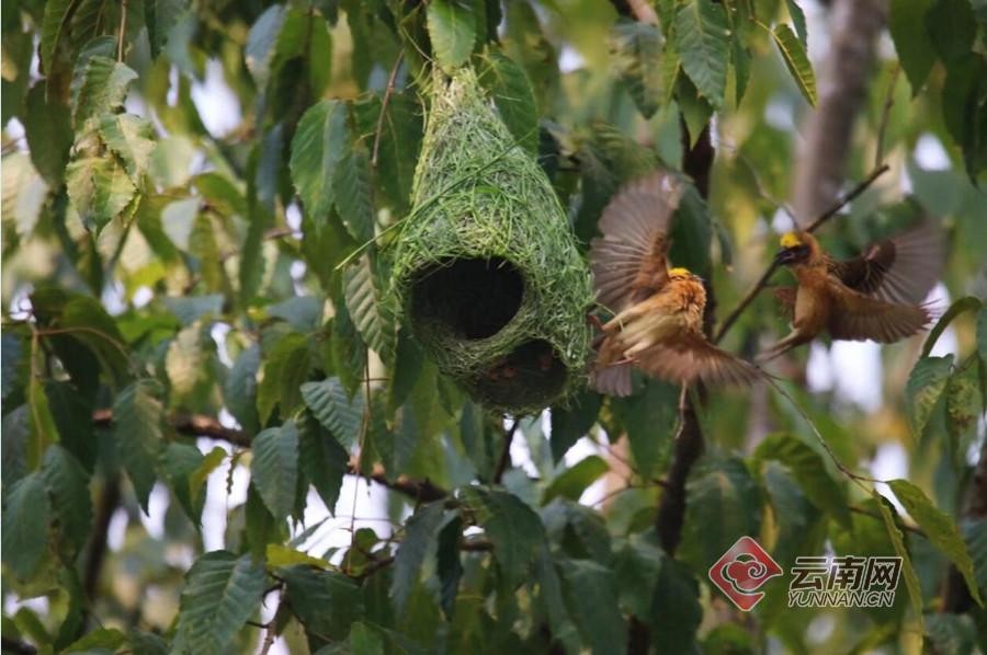 这群鸟筑巢的地方位于孟连县娜允镇芒养村,只见紧挨一起的几棵树上,挂满了黄色和绿色的草袋,不时可以看见鸟儿口中叼着像细丝一样的草在忙碌筑巢,而在一个筑好的巢穴内,一只鸟正在里面休憩,另外一只则在巢穴外守护。