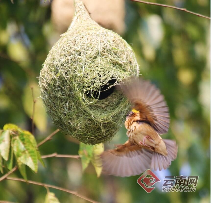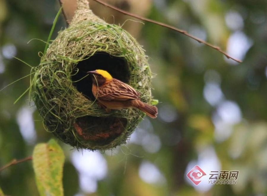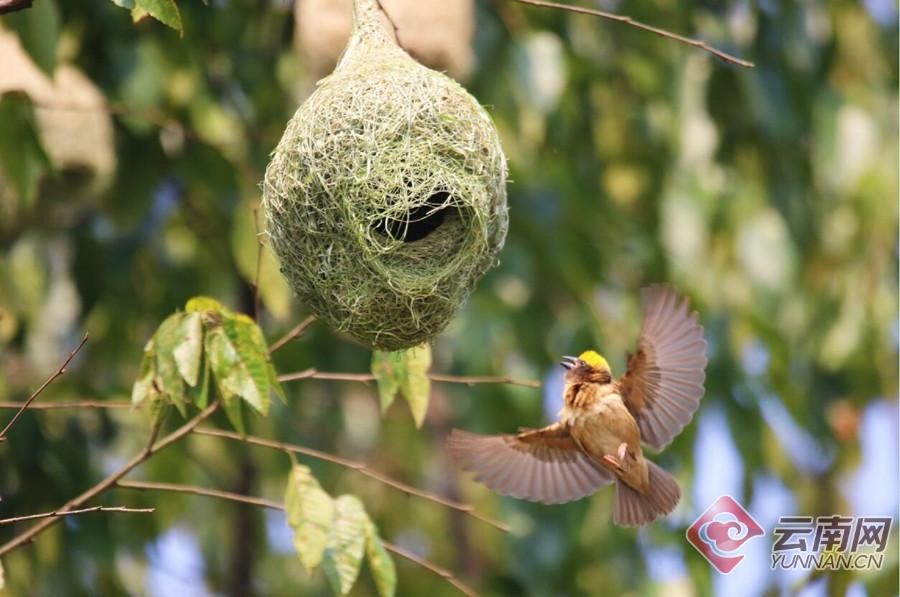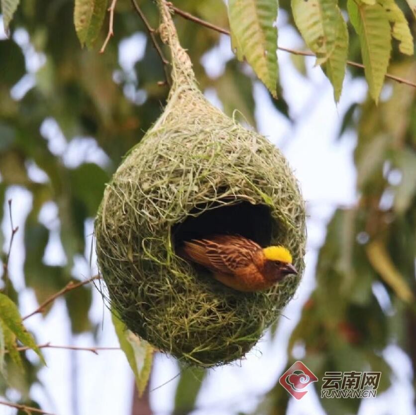 经鉴定,这种喜欢在一起成群筑巢的鸟名叫黄胸织布鸟,是一种小型鸟类,主要分布于巴基斯坦、尼泊尔、马来西亚等国及我国云南南部。黄胸织布鸟的雄鸟可谓是动物界的能工巧匠,它们能用非常细的草把巢穴编织得非常漂亮,不过它们这样做是有目的的,那就是为了吸引雌鸟。