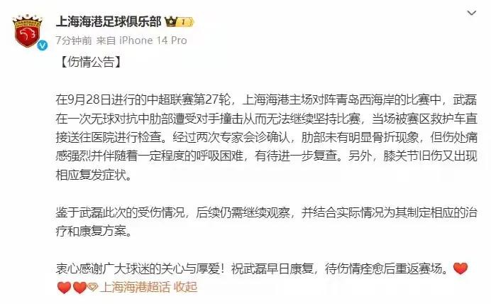 上海海港俱乐部关于武磊的官方通报中还有这样一句话:鉴于武磊此次的受伤情况,后续仍需继续观察,并结合实际情况为其制定相应的治疗和康复方案。