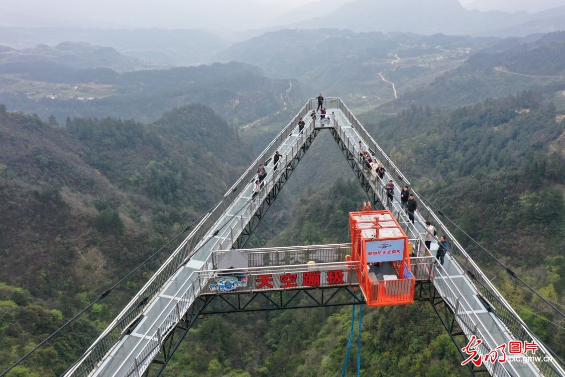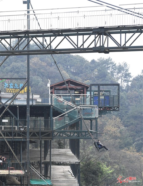 2023年3月22日,重庆万盛,游客在奥陶纪梦幻公园的体验“天空蹦极”。该公园位于万盛黑山之巅,规划面积12.57平方公里,拥有玻璃吊桥、火箭蹦极、大摆锤等38项悬崖高空项目。其中公园特色“天空悬廊”成“A”字形向外悬挑80米,它是奥陶纪独树一帜的原创悬崖美景。(光明网记者季春红摄/光明图片)