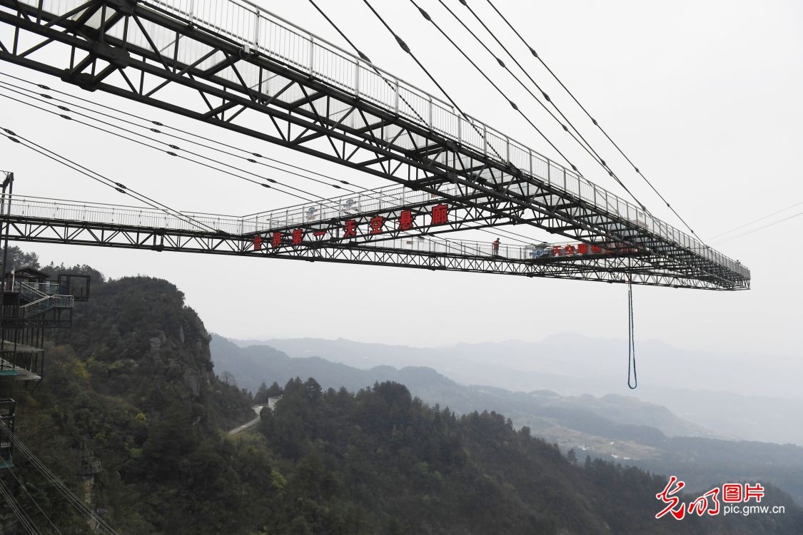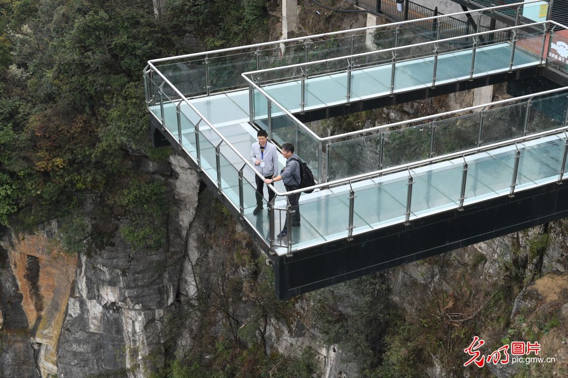 2023年3月22日,重庆万盛,游客在奥陶纪梦幻公园的“天空悬廊”观赏美景。该公园位于万盛黑山之巅,规划面积12.57平方公里,拥有玻璃吊桥、火箭蹦极、大摆锤等38项悬崖高空项目。其中公园特色“天空悬廊”成“A”字形向外悬挑80米,它是奥陶纪独树一帜的原创悬崖美景。(光明网记者季春红摄/光明图片)