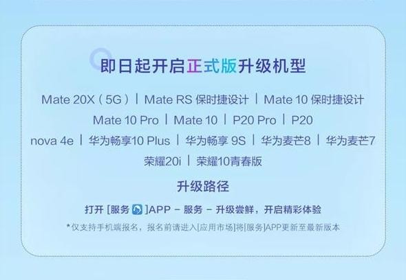 即日起开启正式版升级的机型包括:华为Mate 20X(5G)、Mate RS保时捷设计、Mate 10保时捷设计、Mate 10 Pro、Mate 10、P20 Pro、P20、nova 4e、畅享10 Plus、畅享9S、麦芒8、麦芒7、荣耀20 i、荣耀10青春版。升级路径:打开服务App-服务-升级尝鲜。