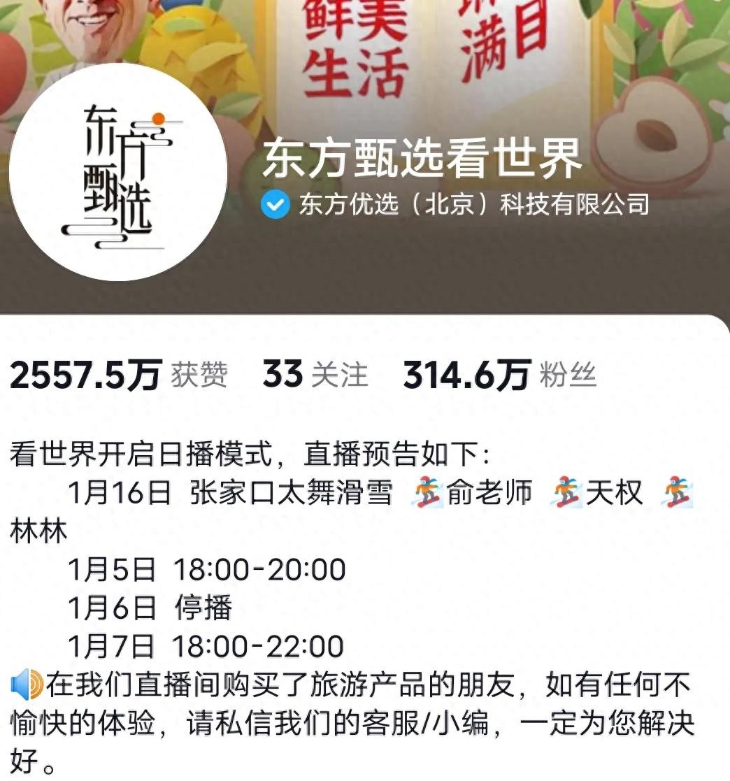 1月16日,天权将和俞老师一起在东方甄选团建的太舞小镇进行看世界直播。