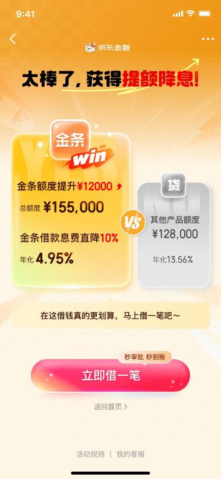 原来,现在京东金条借款开启“专属提额通道”,按页面指引进行额度PK,当用户的金条额度更低时,将根据个人资信情况获得额度和利率的调整机会、现金券或金条专属息费折扣券等奖励,息费折扣券最低可低至5折。