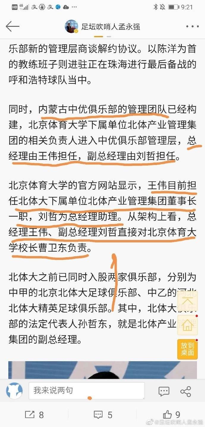 他上传了一张截图,里面部分内容为:“内蒙古中优俱乐部的管理团队已经构建,北京体育大学下属单位北体产业管理集团的相关负责人进入中优俱乐部管理层,总经理由王伟担任,副总经理由刘哲担任。北京体育大学的官方网站显示,王伟目前担任北体大下属单位北体产业管理集团董事长一职,刘哲为总经理助理。从架构上看,总经理王伟、副总经理刘哲直接对北京体育大学校长曹卫东负责。”