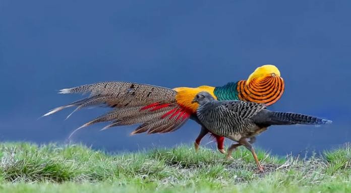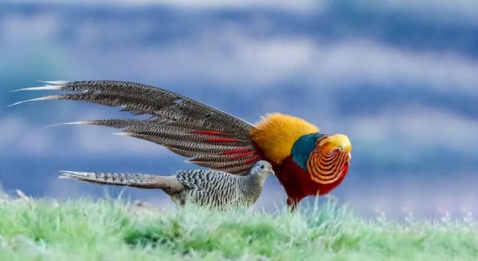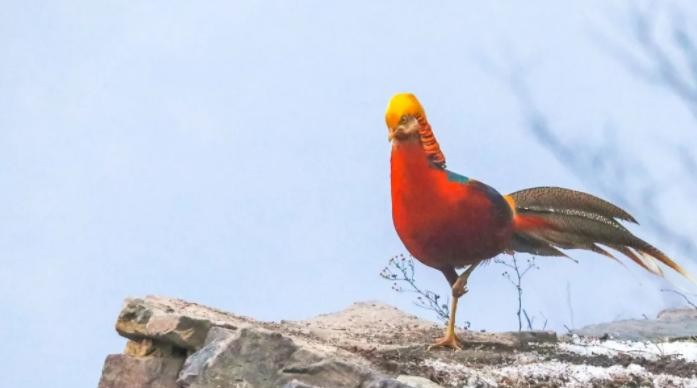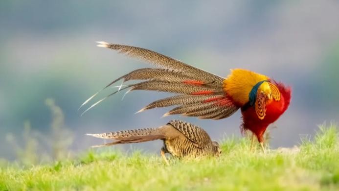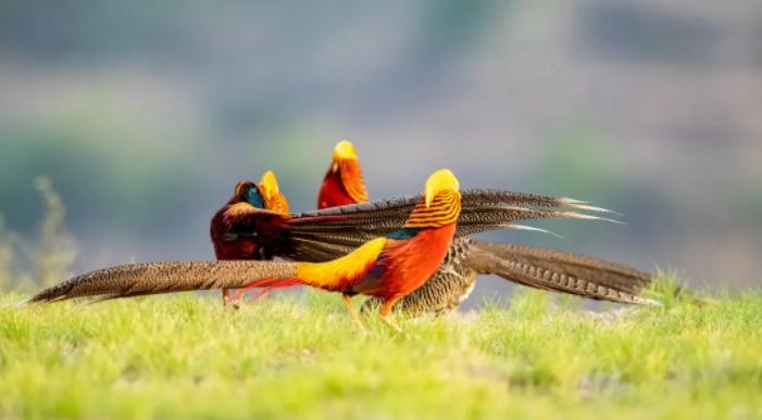 红腹锦鸡:又名金鸡,中型鸡类,体长59-110厘米。尾特长,约38-42厘米。雄鸟羽色华丽,头具金黄色丝状羽冠,上体除上背浓绿色外,其余为金黄色,后颈被有橙棕色而缀有黑边的扇状羽,形成披肩状。下体深红色,尾羽黑褐色,满缀以桂黄色斑点。雌鸟头顶和后颈黑褐色,其余体羽棕黄色,满缀以黑褐色虫蠢状斑和横斑。脚黄色。野外特征极明显,全身羽毛颜色互相衬托,赤橙黄绿青蓝紫俱全,光彩夺目,是驰名中外的观赏鸟类。