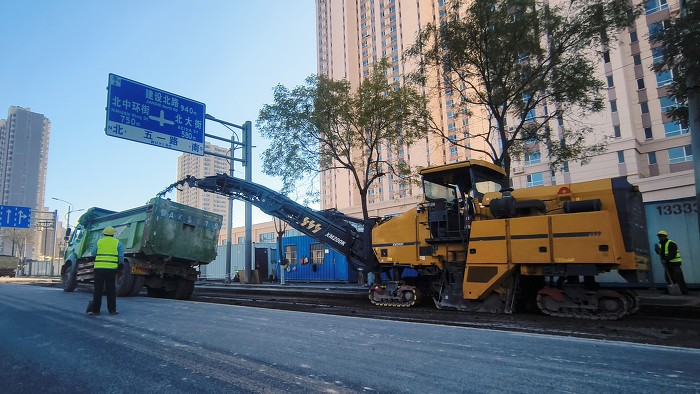▲铣刨机对旧有路面进行铣刨作业