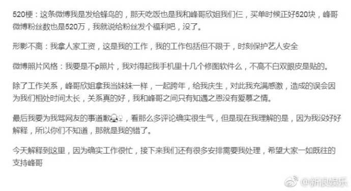 文中解释了拍照站位方向亲密、各种同款、微博中暧昧的文字,称“峰哥和欣姐都把我当妹妹”。又是一个好妹妹啊作为已婚艺人的经纪人虽然有职业需要,但也要懂得点避嫌吧你们相信她的“好兄妹说”吗?