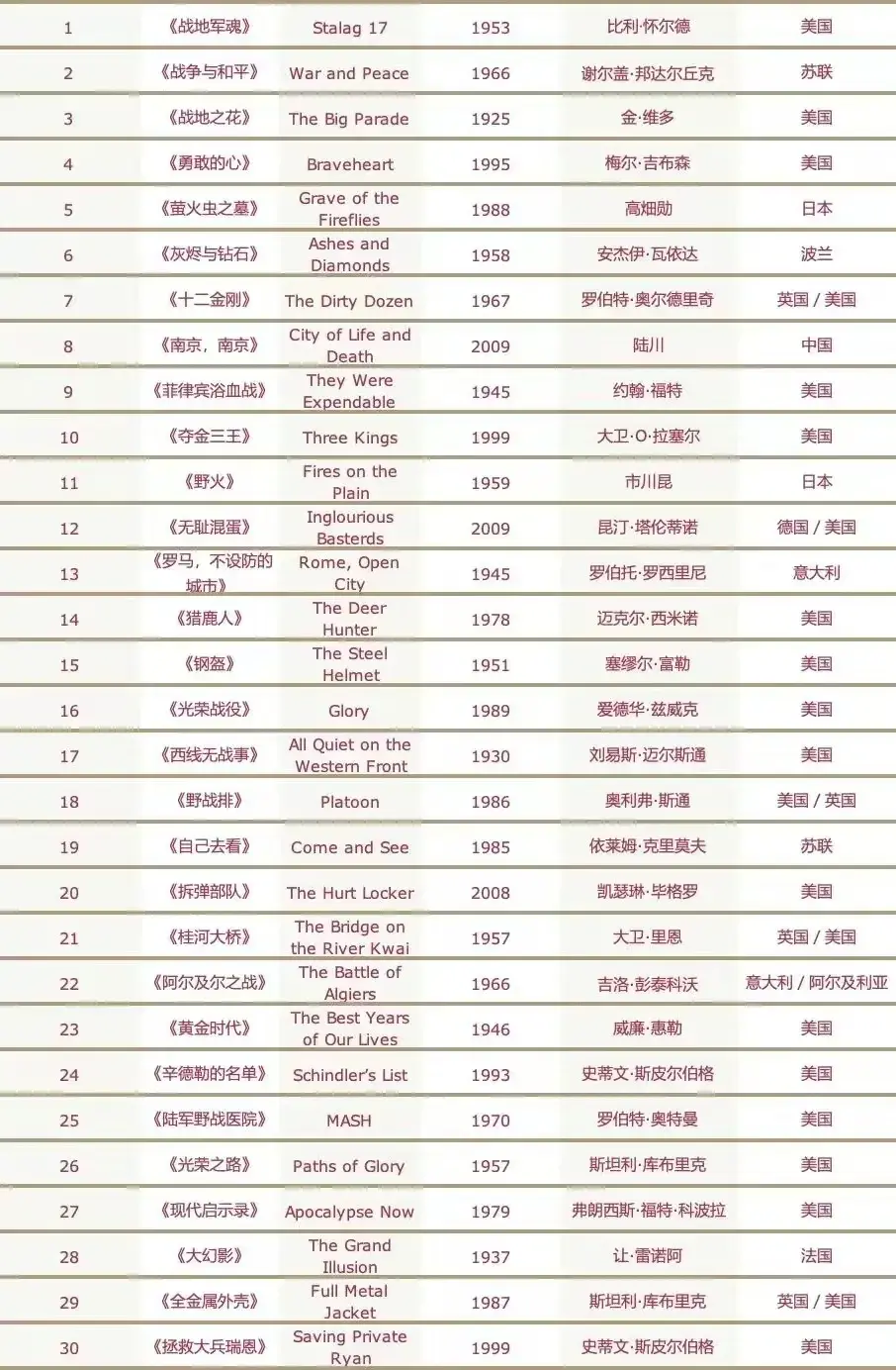 《综艺》杂志“世界最佳战争影片30佳”榜单