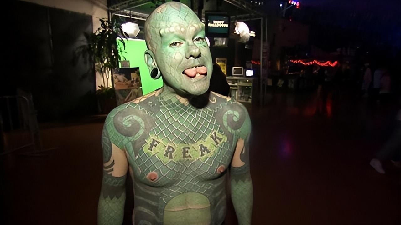 最终他得偿所愿,变成了一个浑身布满绿色纹身,眼球泛黄,舌头分叉的形象。